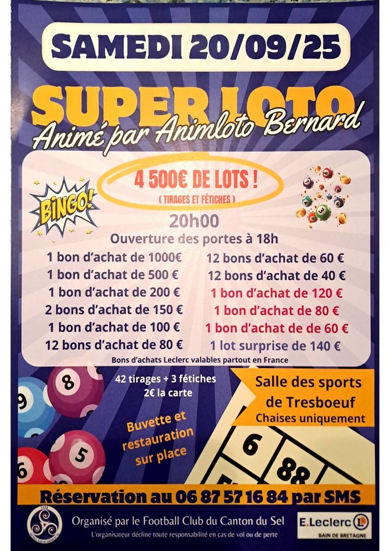 _ SUPER LOTO avec 4000€ de lots (45 tirages dont 3 fétiches - 2 € la carte) dont bons d'achat Leclerc de 700 €, 300 €, 200 €, etc...